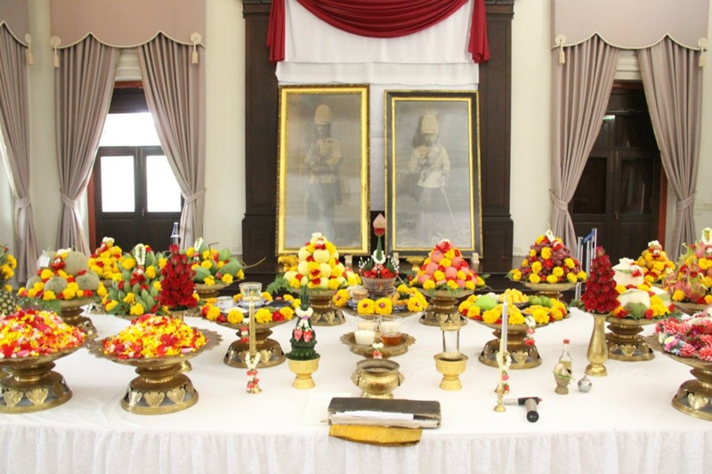 3. จัดเตรียมอุปกรณ์และของถวาย: เตรียมโต๊ะบูชา และของบูชาที่ใช้ในพิธี เช่น ธูป เทียน พานดอกไม้ ข้าวตอก ถั่วงา ผลไม้ หมากพลู ขนม และของคาวหวาน
