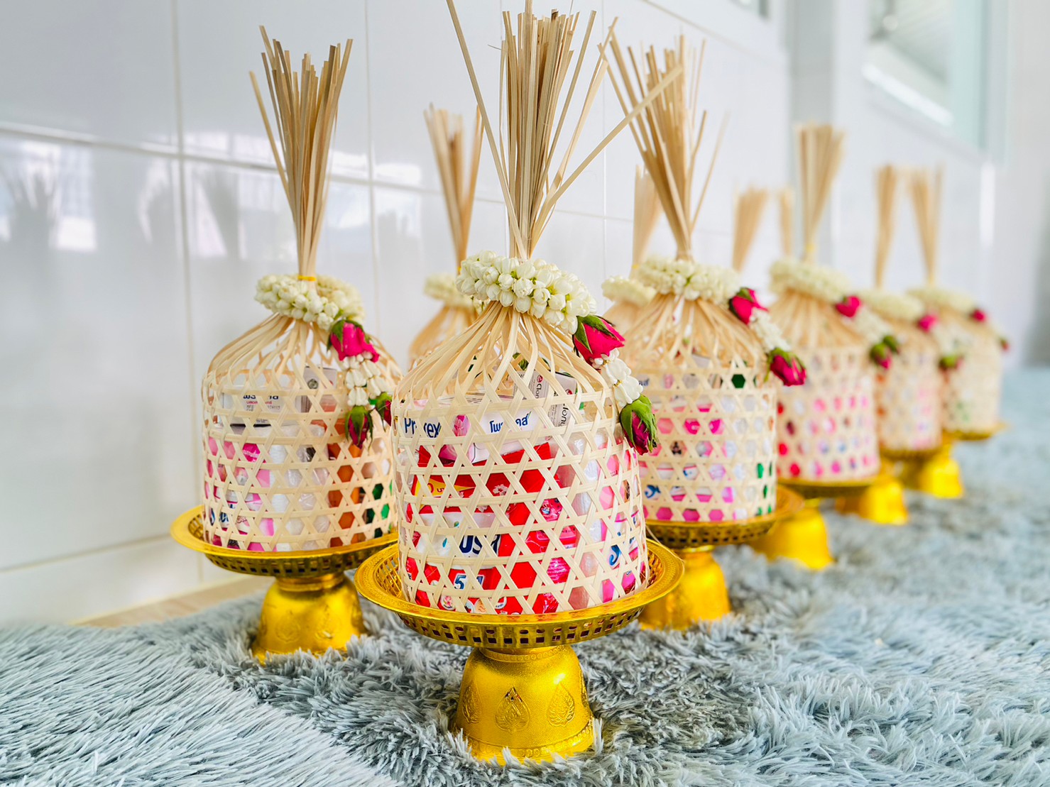4. การเตรียมเครื่องสังฆทานและภัตตาหาร: เจ้าของบ้านเตรียมอาหารและเครื่องสังฆทานถวายพระ การถวายสังฆทานเป็นการทำบุญที่เป็นส่วนหนึ่งของพิธี ส่วนอาหารสำหรับพระสงฆ์จะประกอบด้วยอาหารคาวหวาน น้ำดื่ม และผลไม้